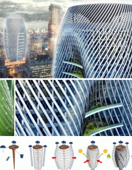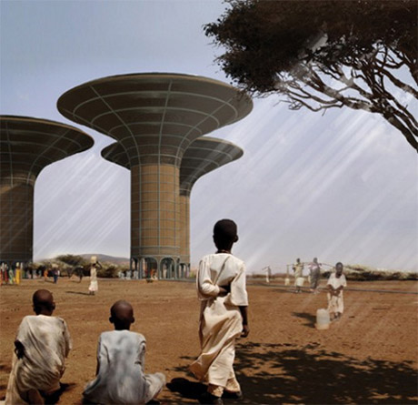 蘇丹摩天水塔 在面積廣闊的蘇丹沙漠,淡水成為最寶貴的資源之一,獲取淡水的難度超乎人們想象。有意思的是,沙漠地下深處也隱藏著世界上最大的地下湖,如果能夠有效加以利用,當地居民的生活便會發(fā)生翻天覆地的變化。波蘭建筑事務所H3AR提出了一種解決之道,即建造外形好似當地猴面包樹的水塔群并利用地下泵抽水。水塔內建有一個水處理廠、一所醫(yī)院、一所學校以及一個食物儲藏中心。6.集雨摩天樓