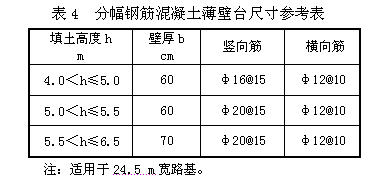 平原區(qū)填土高度h≤6.5 m的小橋,可采用薄壁臺(tái),軟基段宜控制在6.0 m以下?,F(xiàn)運(yùn)營的高速路中有些薄壁臺(tái)出現(xiàn)開裂現(xiàn)象,設(shè)計(jì)時(shí)應(yīng)特別引起注意。