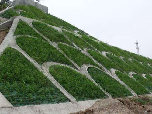 邊坡的植被覆蓋率達(dá)到30%以上時,能承受小雨的沖刷,覆蓋率達(dá)80%以上時能承受暴雨的沖刷。待植物生長茂盛時,能抵抗沖刷的徑流流速達(dá)6m/s,為一般草皮的2倍多。土工網(wǎng)的存在,對減少邊坡土壤的水分蒸發(fā),增加入滲量有良好的作用。同時,由于土工網(wǎng)材料為黑色的聚乙烯,具有吸熱保溫的作用,可促進(jìn)種子發(fā)芽,有利于植物生長。四是快速防護(hù)措施⑴當(dāng)工期與植被培植期發(fā)生矛盾,在工程剛竣工即進(jìn)入暴雨季節(jié)時,需采取“加筋草皮”對工程進(jìn)行快速防護(hù),以便竣工后即可得到全面覆蓋的防沖刷植被。“加筋草皮”采用三維植被網(wǎng)在草坪種植場或工地附近的空地上預(yù)先培植好草皮,成坪后即可整卷或分塊卷起,然后鋪設(shè)至需防護(hù)的邊坡上。⑵在難以治理的干旱地區(qū),可使用土壤凝結(jié)劑,把選擇好的適合的草籽,經(jīng)過特殊處理后,與土壤凝結(jié)劑拌和噴灑(也可以先播草籽,而后再施用土壤凝結(jié)劑)。經(jīng)土壤凝結(jié)劑處理后的坡面,草籽和土壤不會因風(fēng)吹雨淋而流失,同時凝結(jié)劑又降低了土壤中水分的蒸發(fā),在一定程度上保證了草籽的水分供應(yīng),大大提高草籽的成活率。