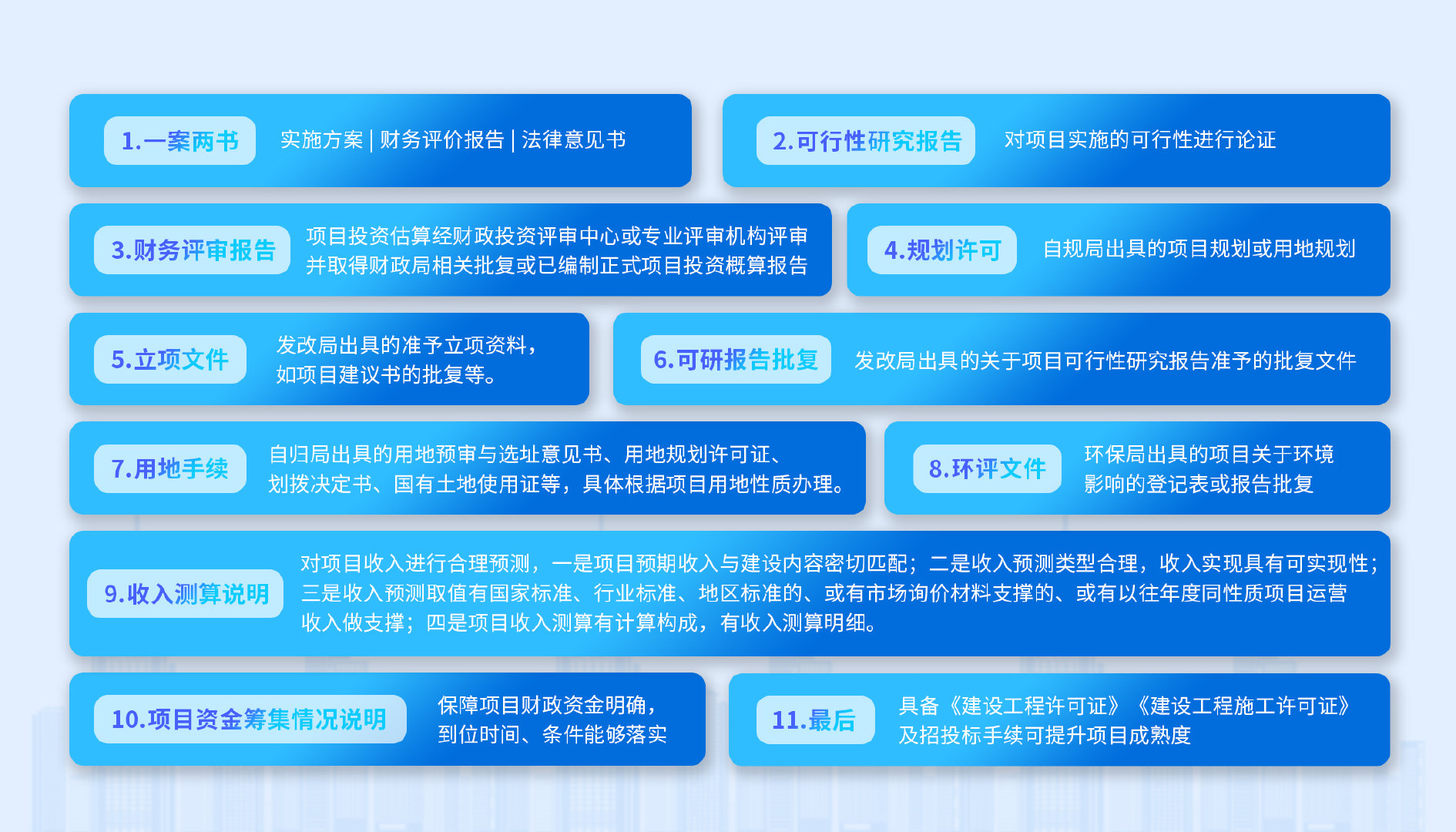 一是由專業(yè)機(jī)構(gòu)撰寫的項(xiàng)目實(shí)施方案(具體包括項(xiàng)目概況、投資測算、收益測算、平衡分析和測算附表),切忌方案強(qiáng)行平衡;