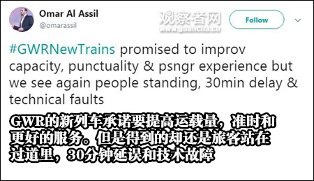 這讓旅客抱怨道:GWR的新列車承諾要提高運載量,準(zhǔn)時和更好的服務(wù)。但是得到的卻還是旅客站在過道里,30分鐘延誤和技術(shù)故障。