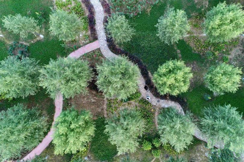 游客在河北省巨鹿縣金玉莊村金銀花園藝小鎮(zhèn)內(nèi)游覽