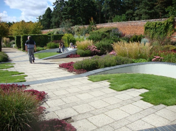 (2)鋪裝材料及鋪砌方式要統(tǒng)一,不宜變化太多。道路鋪裝要整齊、簡潔。一條園路用同一種形式的鋪裝較好,同一條園路上不宜進(jìn)行太多的鋪裝變化,要服從整體的空間需要。一個(gè)空間中所用的鋪裝材料及拼砌圖案也不要過多,材料的過多變化或者過于繁瑣復(fù)雜的拼砌圖案容易造成雜亂無章的感覺。