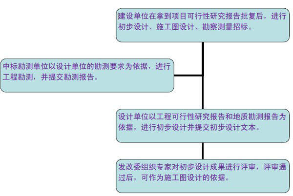 工程設(shè)計(jì)主要包括初步設(shè)計(jì)和施工圖設(shè)計(jì)。對于技術(shù)上復(fù)雜,又缺乏經(jīng)驗(yàn)的項(xiàng)目,可以在初步設(shè)計(jì)和施工圖設(shè)計(jì)兩個(gè)階段間增加技術(shù)設(shè)計(jì)。對于小型并技術(shù)簡單的道路工程,經(jīng)有關(guān)部門同意后,可以利用方案設(shè)計(jì)代替初步設(shè)計(jì),按方案設(shè)計(jì)審批后直接轉(zhuǎn)入施工圖設(shè)計(jì)。典型的流程圖如下: