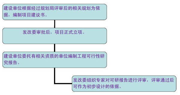 市政工程設(shè)計(jì)的前期工作主要包括項(xiàng)目立項(xiàng)、預(yù)可行性研究和工程可行性研究。對已明確建設(shè)必要性的工程項(xiàng)目,前期工作可以直接進(jìn)入工程可行性研究。典型的流程圖如下: