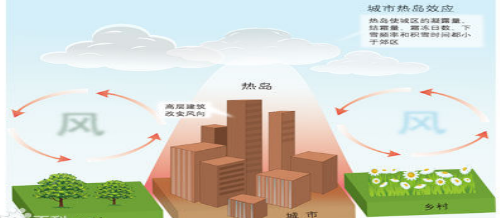城市人口集中,工業(yè)發(fā)達(dá),交通擁塞,大氣污染嚴(yán)重,城市建筑大多為石材和混凝土,其熱容量低,熱傳導(dǎo)率高,加上建筑物本身對風(fēng)的阻擋或減弱作用,致城市年平均氣溫比郊區(qū)偏高(可高2℃以上),在溫度的空間分布上, 城市猶如一個(gè)溫暖的島嶼。