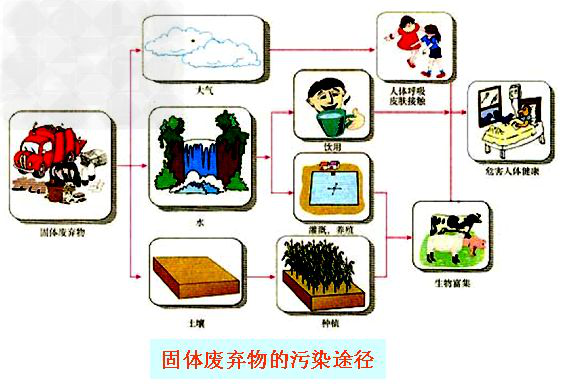 固體廢物特別是有害固體廢物能通過不同途徑危害人體健康。通常,工礦業(yè)固體廢物所含化學成分能形成化學物質型污染、人畜糞便和生活垃圾能形成病原體型污染。
