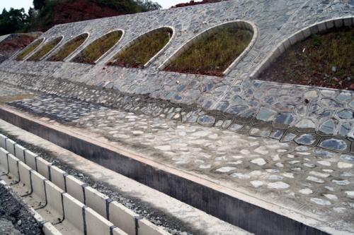 (2)路基填土高度H>3m,時,采用漿砌片石襯砌拱防護(hù),當(dāng)3&1e;H&1e;4m時,設(shè)置單層襯砌拱,當(dāng)4<H&1e;6m時,設(shè)置雙層襯砌拱,拱內(nèi)鋪設(shè)草坪網(wǎng)布被為保證路面水或坡面水不沖刷護(hù)坡道,相應(yīng)于襯砌拱拱柱部分的護(hù)坡道也做鋪砌,并設(shè)置20號混凝土預(yù)制塊至邊溝內(nèi)側(cè)。20號混凝土預(yù)制塊的規(guī)格分為兩種,拱柱及護(hù)腳采用5cm×30cm×50cm的長方體預(yù)制塊,拱圈部分采用5cm×30cm×65cm的弧形預(yù)制塊(圓心角30度,內(nèi)徑125cm,外徑130cm),預(yù)制塊間用7.5號砌漿灌注。