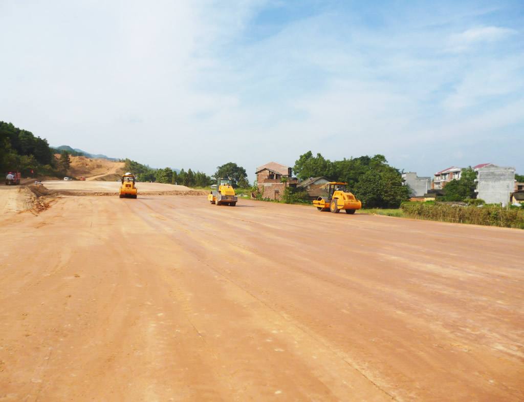 6、路基碾壓。其方法是:第一遍用震動(dòng)壓路機(jī)靜壓進(jìn)行穩(wěn)壓,然后再震動(dòng)壓實(shí)。