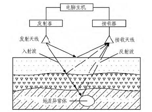 地質(zhì)雷達(dá)是一種根據(jù)巖體介質(zhì)的電性差異對巖體介質(zhì)或地質(zhì)異常體進(jìn)行探測的電磁波探測技術(shù)[13]。通過地質(zhì)雷達(dá)天線向巖體內(nèi)部發(fā)射電磁波,電磁波在不同電性差異界面反射,反射回來的電磁波被接收天線接收,接收數(shù)據(jù)再傳至電腦進(jìn)行處理,其探測原理如圖1 所示。通過對采集的數(shù)據(jù)進(jìn)行處理,得到雷達(dá)反射圖像,對圖像進(jìn)行分析,并結(jié)合現(xiàn)場實(shí)際情況,可以推測不良地質(zhì)體的類型、位置及其分布特點(diǎn)[14]。