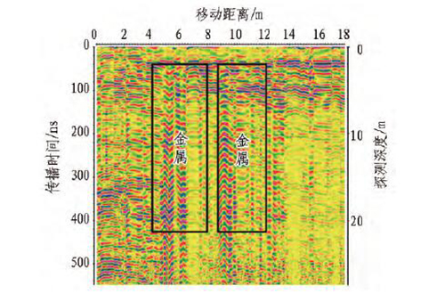 1) 地質(zhì)雷達(dá)探測時(shí)需將金屬物體移至測線外一定距離。對于會(huì)對探測結(jié)果產(chǎn)生干擾又無法移走的干擾體,應(yīng)詳細(xì)記錄其相關(guān)信息,包括干擾體的屬性與大小以及干擾體與測線的相對位置關(guān)系等,并通過信號(hào)處理從雷達(dá)圖像上識(shí)別或剔除干擾波,降低誤判率。