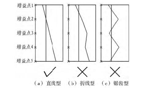 地質(zhì)雷達(dá)探測時(shí),電磁波由探測面向遠(yuǎn)處傳播,部分能量會(huì)被介質(zhì)吸收掉,反射波能量相應(yīng)減少。距離天線越近反射波能量越大,距離天線越遠(yuǎn)反射波能量越小,會(huì)在雷達(dá)圖像上反映出比較明顯的能量分層帶,越靠近探測表面信號(hào)越強(qiáng),遠(yuǎn)端信號(hào)較弱,因此,需要進(jìn)行增益調(diào)節(jié)來放大有效信號(hào)。正確的增益調(diào)節(jié)方式如圖8( a) 所示。增益調(diào)節(jié)的原則是保證增益點(diǎn)之間線性變化,同時(shí)應(yīng)使反射能量控制在一定的范圍。增益太大會(huì)造成削波現(xiàn)象,掩蓋有效信號(hào),增益太小有效信號(hào)不明顯,異常體位置不突出[14]。應(yīng)根據(jù)隧道的實(shí)際情況,將天線移至探測位置,采用先自動(dòng)后手動(dòng)的方法調(diào)節(jié)增益。