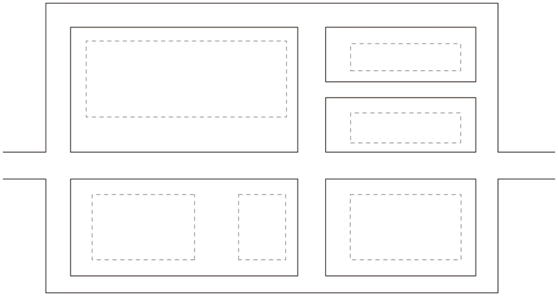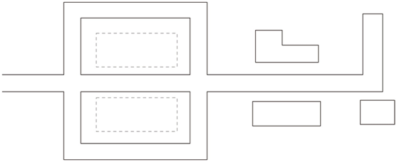 道路主要平行于主要建筑、構(gòu)筑物,圍繞各庫房進行布置,這種道路布置形式受地形條件限制,一般不宜在山區(qū)丘陵地區(qū)采用,且道路的總長度及占地較多,對于交通繁忙、車流和人流組織需要分離的采用,如圖所示。