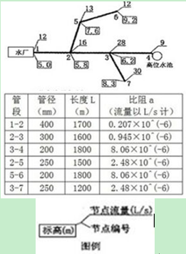 某城市采用枝狀管網供水,節(jié)點流量、地面標高如圖所示,各管段長度、管徑、比阻見下表,節(jié)點4處設一高位水池,最高日總用水量120L/s,其中20L/s由高位水池供給,要求管網最小服務水頭為20m。