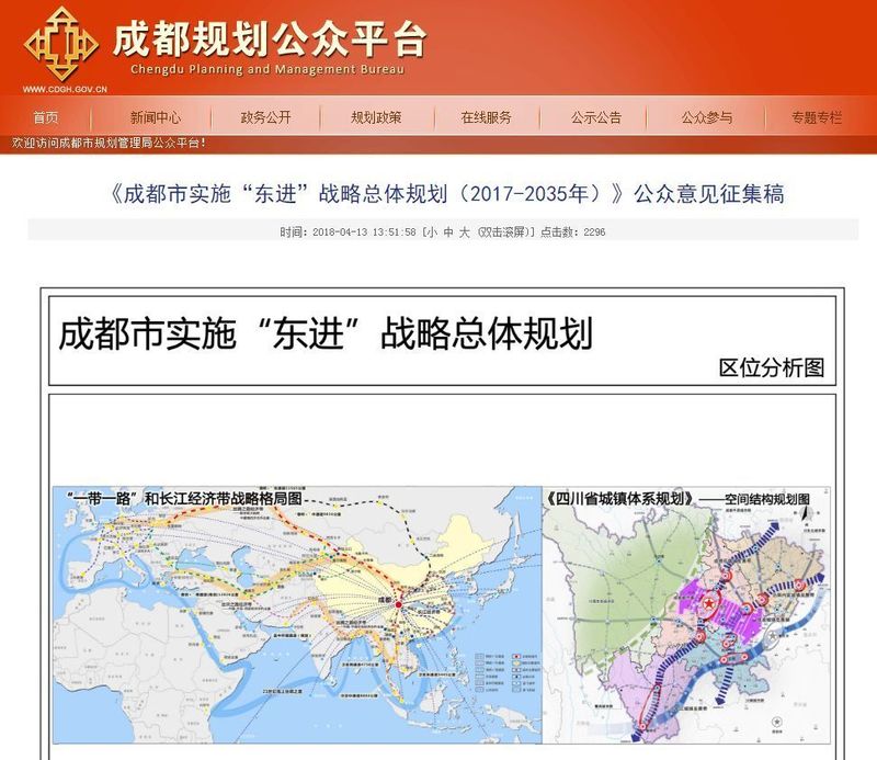 文件還顯示,2017年5月以來,成都市有關(guān)部門同步組織開展了《成都市實(shí)施 “ 東進(jìn) ” 總體戰(zhàn)略研究》和《成都市實(shí)施 “ 東進(jìn) ” 戰(zhàn)略總體規(guī)劃》兩項(xiàng)工作,近一年的時(shí)間里,結(jié)合多次會(huì)議意見及相關(guān)區(qū)(市)縣、市級(jí)部門書面反饋意見,經(jīng)過多輪修改完善,才形成今天的最新規(guī)劃藍(lán)圖。