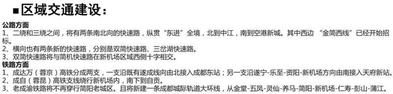 依托成巴高速、成南高速、天府國際機(jī)場(chǎng)高速等“六射一環(huán)”高速公路輻射區(qū)域,帶動(dòng)區(qū)域協(xié)同發(fā)展。建設(shè)金簡(jiǎn)仁快速、中金簡(jiǎn)快速、成資快速等多條區(qū)域快速通道,帶動(dòng)沿線城鄉(xiāng)發(fā)展。