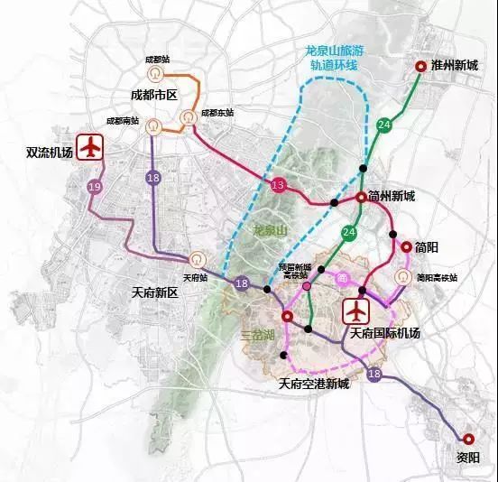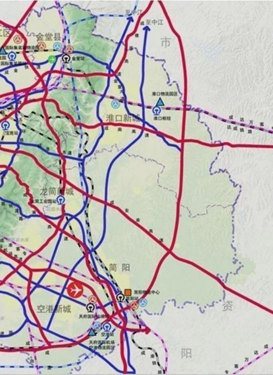 依托既有成渝鐵路、達(dá)成鐵路和規(guī)劃貨運(yùn)外繞線,連接青白江國際鐵路港,融入 “ 蓉歐+ ” 。淮州新城預(yù)留國際鐵路港功能。規(guī)劃建設(shè)蓉昆高鐵成自段、成達(dá)萬高鐵等7條出川高鐵,融入國家高鐵網(wǎng)絡(luò)。推動(dòng)成渝客專、遂成鐵路和蓉昆高鐵成自段等鐵路公交化運(yùn)營,強(qiáng)化區(qū)域協(xié)作。依托18號(hào)線、13號(hào)線等軌道快線,實(shí)現(xiàn)中心城區(qū)和東部城市新區(qū) “ 半小時(shí) ” 到達(dá)機(jī)場(chǎng)。