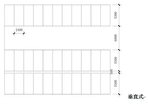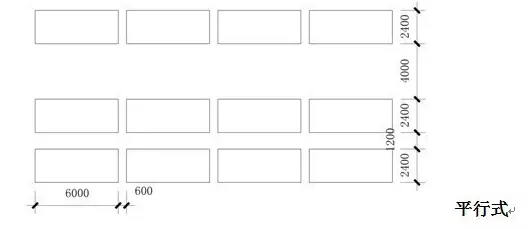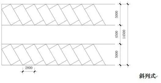 根據(jù)地形條件以占地面積小、疏散方便、保證安全為原則,主要停車(chē)方式有平行式、斜列式、垂直式三種。其中間最小距離以小型車(chē)為例,停車(chē)方式見(jiàn)下圖