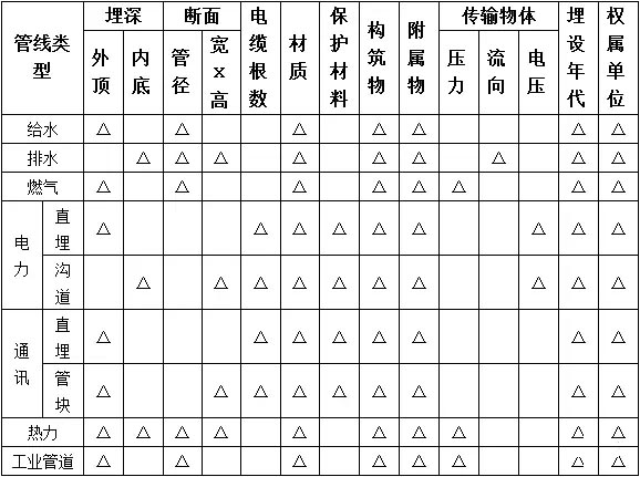 地下管線調(diào)查應(yīng)在地下管線現(xiàn)況調(diào)繪圖所標(biāo)示各類(lèi)地下管線位置的基礎(chǔ)上,通過(guò)對(duì)所出露的地下管線及附屬設(shè)施按下表的調(diào)查項(xiàng)目要求詳細(xì)核查地下管線及其附屬物的各屬性,做好記錄和量測(cè)。