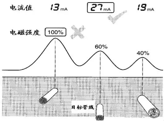 當(dāng)用直接法工作時(shí),被施加信號(hào)的目標(biāo)管線上電流最大,而其它并行管線電流為感應(yīng)電流,電流值較小,通過(guò)測(cè)量出電流值大小方法區(qū)分出目標(biāo)管線。(如圖)