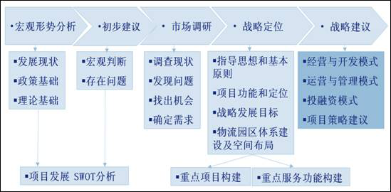 我們根據(jù)多年的工作經驗,總結了自己使用的物流園區(qū)項目戰(zhàn)略規(guī)劃和定位研究的一般方法論(如下圖所示),并要做好以下工作: