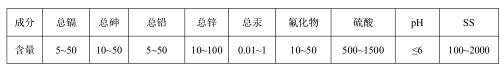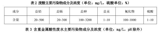 含重金屬酸性廢水主要產(chǎn)生于制酸凈化工段電除霧沖洗、沖渣、濕法收塵、濕法車間、地面沖洗、實(shí)驗(yàn)室、有害渣庫(kù)滲濾等,主要污染物有重金屬離子、酸、懸浮物等。