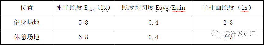 (3)健身場(chǎng)地照明要有足夠的水平照度和垂直照度,同時(shí)要有足夠的均勻度。休閑場(chǎng)地照明應(yīng)滿足交流、觀賞和安全需求。見表3-2。