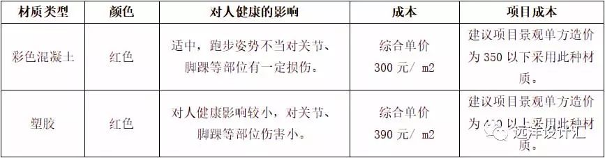 根據(jù)鋪裝材質(zhì)、顏色對(duì)人健康的影響,綜合項(xiàng)目成本控制,居住區(qū)慢跑步道鋪裝材質(zhì)選擇見下表3-1: