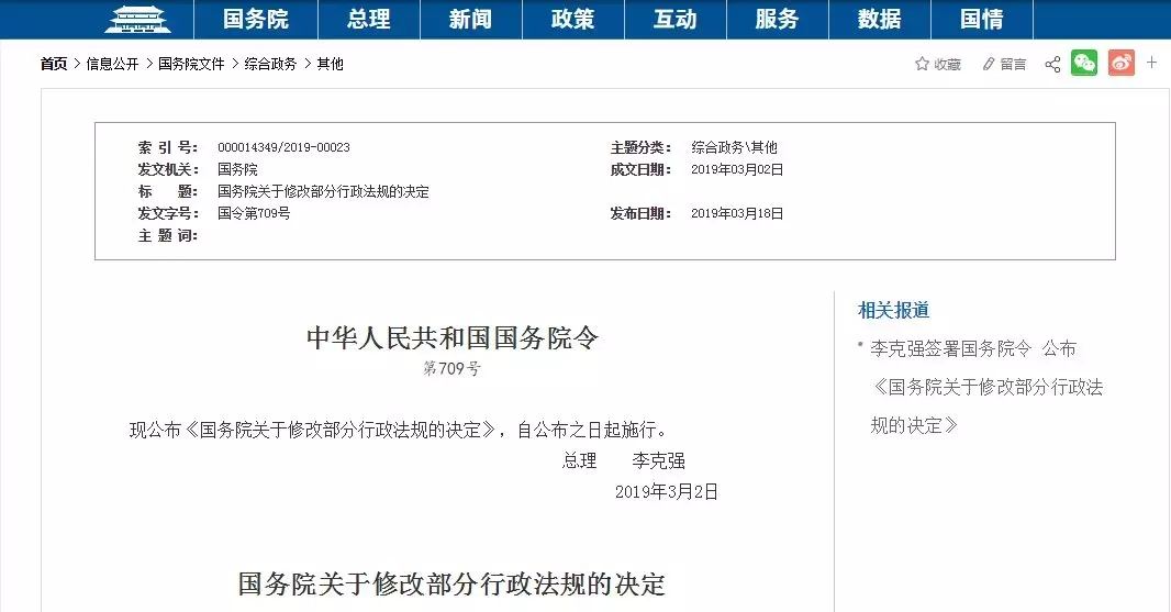 2019年3月18日,中國(guó)國(guó)務(wù)院總理李克強(qiáng)簽署國(guó)務(wù)院令,公布《國(guó)務(wù)院關(guān)于修改部分行政法規(guī)的決定》(以下簡(jiǎn)稱《決定》),自公布之日起施行。