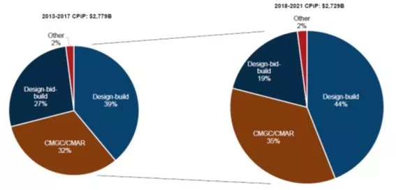 根據(jù)美國設計建造學會和FMI咨詢公司的研究,2013年到 2017年期間,美國工程建設市場上DB模式占比最高,達 39%;2018年到2021年的預測表明,DB模式占比將進一步擴大,達到44%。