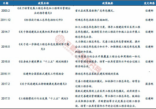 ——自2003年開始,國(guó)家陸續(xù)出臺(tái)政策推廣總承包模式,并引導(dǎo)裝配式建筑原則上使用總承包模式。2016年住建部發(fā)布《關(guān)于進(jìn)一步推進(jìn)工程總承包發(fā)展的若干意見》,《意見》強(qiáng)調(diào)大力推進(jìn)工程總承包,提升項(xiàng)目可行性研究和初步設(shè)計(jì)深度,實(shí)現(xiàn)設(shè)計(jì)、采購(gòu)、施工等各階段工作的深度融合,提高工程建設(shè)水平。