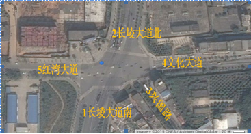 該交叉口位于江西省南昌市新建區(qū)中心城區(qū)西部。由長堎大道、紅灣大道、文化大道、興國路五路交叉組成。其中長堎大道南北方向雙向六車道主干道,紅灣大道、文化大道是連接新建區(qū)和灣里區(qū)的主要交通干道,興國路連接新建區(qū)中心城區(qū)并設(shè)有多條公交線路。該交叉處在新建區(qū)大力開發(fā)地段,周邊居民區(qū)密集、各道路沿途設(shè)有多家商業(yè)和購物中心,并輻射周邊的高校園區(qū)和工業(yè)園區(qū)。由于交叉口交通流量較大、多路相交,加上長堎大道建成通車后未能對(duì)交叉口各進(jìn)出口道和內(nèi)部空間進(jìn)行科學(xué)合理的交通渠化設(shè)計(jì),導(dǎo)致交通混行,交通擁堵現(xiàn)象經(jīng)常發(fā)生。交叉口現(xiàn)狀如圖-1所示。