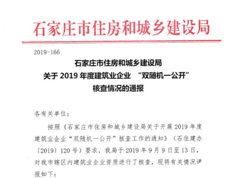 月26日石家莊住房和城鄉(xiāng)建設(shè)局發(fā)布《關(guān)于2019年度建筑業(yè)企業(yè) “雙隨機(jī)一公開” 核查情況的通報》,2019年9月9日至13日石家莊住房和城鄉(xiāng)建設(shè)局對轄區(qū)內(nèi)建筑業(yè)企業(yè)資質(zhì)進(jìn)行了核查,本次共核查238家建筑業(yè)企業(yè),其中僅41家達(dá)到資質(zhì)標(biāo)準(zhǔn)要求,共有135家企業(yè)不合格。