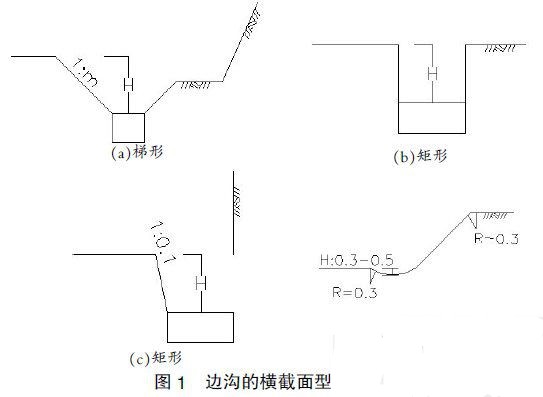 邊溝一般不需要進(jìn)行水文和水力計(jì)算,可根據(jù)沿線情況,選用標(biāo)準(zhǔn)橫斷面形式.邊溝可采用三角形、流線形、梯形或矩形橫斷面(如下圖).底寬與深度都不應(yīng)小于0.4m;農(nóng)村公路受條件限制,需采用矩形斷面時(shí),應(yīng)盡可能在頂面加帶槽孔的混凝土蓋板,以防止生活垃圾或雜物堵塞邊溝.當(dāng)采用梯形橫斷面時(shí),邊溝內(nèi)側(cè)邊坡坡度按土質(zhì)類別采用1:1~1:1.5.