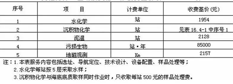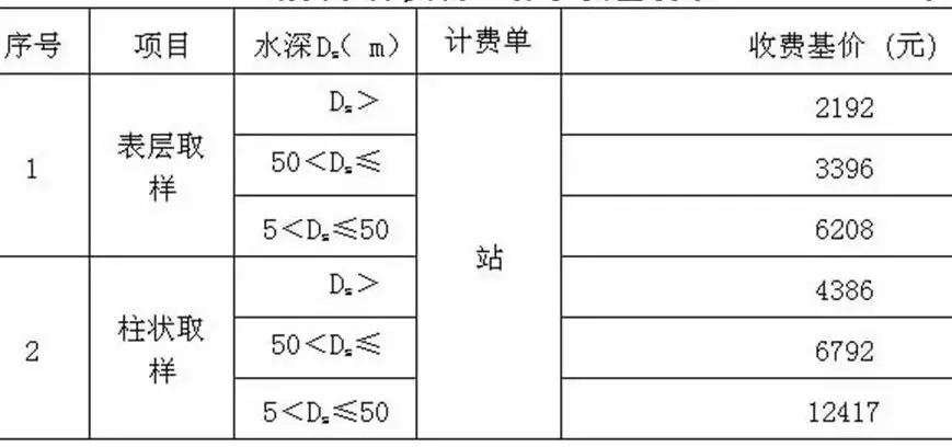 在《工程勘察收費標準》里,除了看2.3節(jié)里的“水域測量”部分外,還需要關(guān)注第16部分的“海洋工程勘察”部分,該部分對多波束海底地形測量,海底面狀況掃側(cè),底質(zhì)取樣,氣象、潮位、波浪觀測,海流、鹽度、泥沙觀測,海洋工程地質(zhì)鉆探,海底地層測量,及其他海洋工程勘察項目,等等都作出了勘察收費依據(jù)。這里,海底面狀況掃側(cè)是指掃海測量,海底地層測量可以對應(yīng)淺地層剖面測量。而海底地層測量又細分聲學地層探測、單道地震探測及多道地質(zhì)探測三類。在其他海洋工程勘察項目部分中,地磁觀測可以與海洋磁力測量對應(yīng),另外還包括沉積物化學、污損生物、水化學等內(nèi)容。