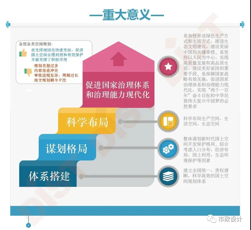 2019年5月23日,中共中央、國(guó)務(wù)院《關(guān)于建立國(guó)土空間規(guī)劃體系并監(jiān)督實(shí)施的若干意見(jiàn)》正式印發(fā),明確要建立國(guó)土空間規(guī)劃體系并監(jiān)督實(shí)施,將主體功能區(qū)規(guī)劃、土地利用規(guī)劃、城鄉(xiāng)規(guī)劃等空間規(guī)劃融合為統(tǒng)一的國(guó)土空間規(guī)劃,實(shí)現(xiàn)“多規(guī)合一”,強(qiáng)化國(guó)土空間規(guī)劃對(duì)各專項(xiàng)規(guī)劃的指導(dǎo)約束作用。此舉是黨中央、國(guó)務(wù)院作出的重大部署。