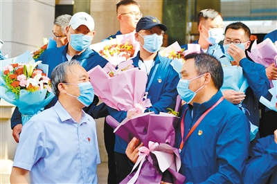 下午4點左右,29名珠峰高程測繪隊員們在大家翹首期盼下回到省測繪地理信息局。彼時,留守在“家”的戰(zhàn)友和家人們早已經(jīng)在這里等候他們。短暫的歡迎儀式后,家人和朋友們擁抱和握手成為他們表達思念的方式。這29名測繪隊員不少人已經(jīng)在珠峰待了兩三個月,有的甚至時間更長,回到西安讓他們感到格外親切。“我從過年前就去拉薩集訓了,有大半年時間都沒有見到孩子了。太想念家人,想念西安的肉夾饃、泡饃啦!”皮膚黝黑的測繪隊員邢雄旺說。