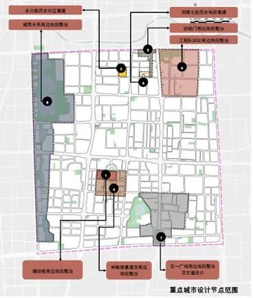 八個空間景觀節(jié)點包括:唱經(jīng)樓周邊地段、永興路歷史社區(qū)、拱極門周邊地段、鐘鼓樓復建及周邊地段、壩陵北街歷史地段、工程隊舊址周邊地段、五一廣場周邊地段及文道設計、城西水系周邊地段。
