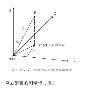 P點(diǎn)這個(gè)定位點(diǎn)的三維坐標(biāo)方程式是根據(jù)全站儀三維坐標(biāo)法測量原理而建立的,圖1為全站儀三維坐標(biāo)法計(jì)算原理。