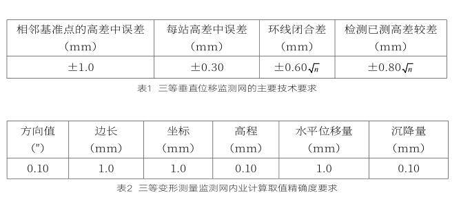 沉降觀測點(diǎn)設(shè)置于橫梁的頂面或塔柱的側(cè)面(共兩個(gè))。沉降測量采用精密水準(zhǔn)儀幾何水準(zhǔn)法和三角高程對(duì)向觀測法。按《工程測量規(guī)范》(GB 50026-2007)三等垂直位移變形測量進(jìn)行施測,三等垂直位移監(jiān)測網(wǎng)的主要技術(shù)要求見表1。三等變形測量監(jiān)測網(wǎng)內(nèi)業(yè)計(jì)算取值精確度要求見表2。