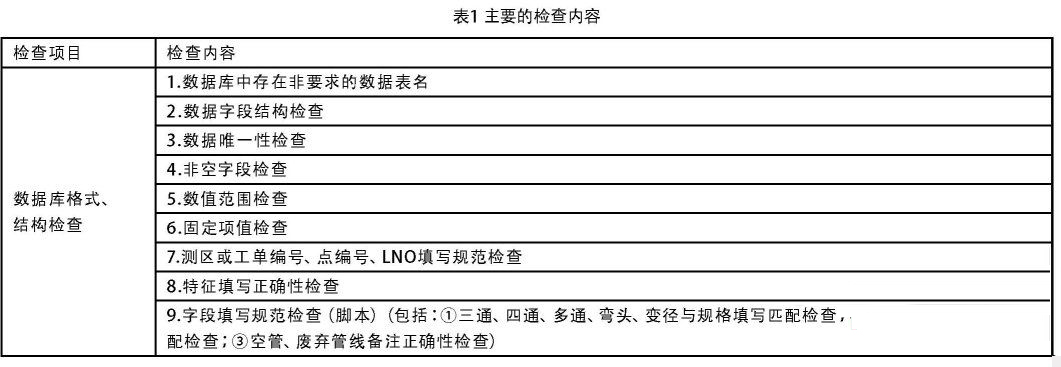 目前,全國各管線單位要求生產(chǎn)單位提交的數(shù)據(jù)集一般是Microsoft Office Access數(shù)據(jù)庫的mdb文件.數(shù)據(jù)庫格式、結(jié)構(gòu)檢查主要檢查管線數(shù)據(jù)庫中的數(shù)據(jù)表是否齊全是否存在多余的表、表的字段名和數(shù)據(jù)類型是否正確、字段值的填寫格式是否符合規(guī)程的要求等.主要的檢查內(nèi)容見表1: