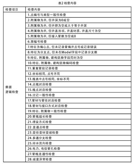 數(shù)據(jù)邏輯性檢查復(fù)雜多樣,主要包括: 屬性值的邏輯一致性檢查, 管線、管點要素邏輯結(jié)構(gòu)的合理性、正確性等.例如,在管線點數(shù)據(jù)表和管線段數(shù)據(jù)表中管線點編號相同的點,其坐標必須相同;如果附屬物為井,井深可定不能為0或空;個別管線段出現(xiàn)倒流的現(xiàn)象.主要的檢查內(nèi)容見表2:
