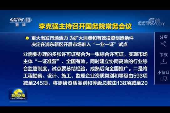 國務(wù)院總理李克強11月11日主持召開國務(wù)院常務(wù)會議,聽取國務(wù)院第七次大督查情況匯報,確保政策落實,更好發(fā)揮促進經(jīng)濟穩(wěn)定恢復(fù)的重要作用;決定在浦東新區(qū)開展市場準入“一業(yè)一證”試點,在全國大幅壓減建設(shè)工程企業(yè)和測繪資質(zhì)并加強監(jiān)管,更大激發(fā)市場活力,為擴大消費和有效投資創(chuàng)造條件。