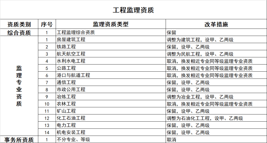 監(jiān)理專業(yè)資質(zhì)等級壓減為甲、乙兩級,原丙級資質(zhì)并入相應(yīng)專業(yè)的乙級資質(zhì)。取消事務(wù)所資質(zhì)。