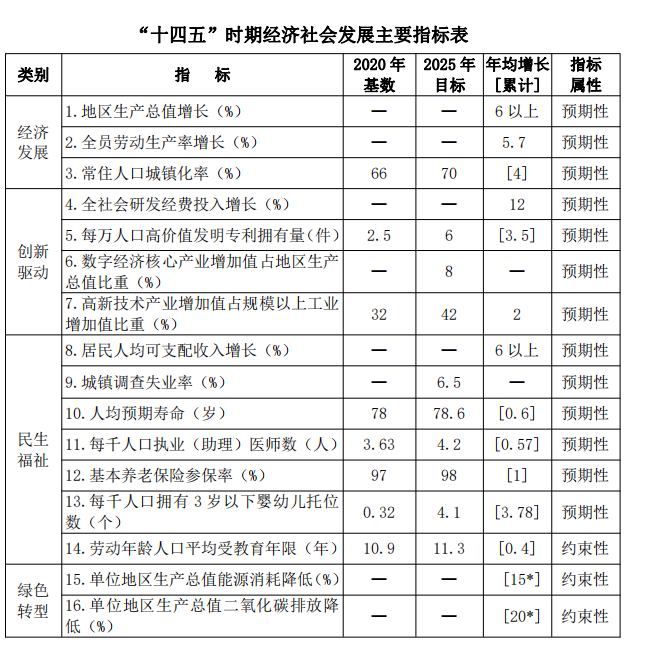 ——經(jīng)濟(jì)質(zhì)量效益顯著提升。京津冀協(xié)同創(chuàng)新共同體建設(shè) 縱深推進(jìn),高質(zhì)量發(fā)展體系更加完善,科技進(jìn)步貢獻(xiàn)率明顯上 升,產(chǎn)業(yè)基礎(chǔ)高級(jí)化、產(chǎn)業(yè)鏈現(xiàn)代化水平大幅提升,農(nóng)業(yè)基礎(chǔ) 更加穩(wěn)固,實(shí)體經(jīng)濟(jì)、先進(jìn)制造業(yè)、數(shù)字經(jīng)濟(jì)加快發(fā)展,現(xiàn)代 服務(wù)業(yè)高質(zhì)量提升。綜合經(jīng)濟(jì)實(shí)力和政府財(cái)力再上新臺(tái)階,全市生產(chǎn)總值、一般公共預(yù)算收入年均增長(zhǎng)分別達(dá)到 6%以上、 10.6%,總量分別達(dá)到 8000 億元、1000 億元,省會(huì)首位度進(jìn)一 步彰顯,區(qū)域中心城市輻射帶動(dòng)能力和城鄉(xiāng)區(qū)域發(fā)展協(xié)調(diào)性明 顯增強(qiáng)。