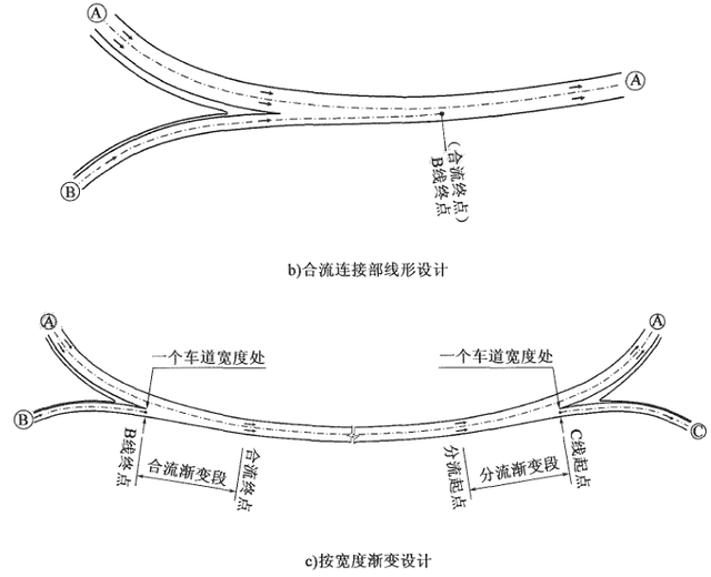 合流原則上,與分流相逆。依據(jù)交通量大小,按車道數(shù)和通行能力平衡的原則: