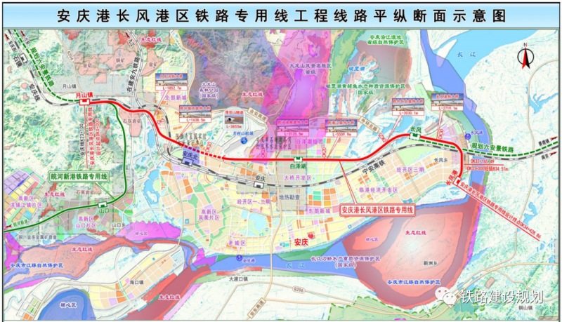 長風(fēng)港區(qū)鐵路專用線主要承擔(dān)長風(fēng)港區(qū)鐵水聯(lián)運(yùn)以及臨港企業(yè)的運(yùn)輸任務(wù),是全國十二個(gè)鐵水聯(lián)運(yùn)示范項(xiàng)目之一。項(xiàng)目位于安徽省安慶市懷寧縣、宜秀區(qū)、大觀區(qū)、迎江區(qū)境內(nèi),線路自合九鐵路安慶線新設(shè)月山鎮(zhèn)站引出,向東沿城市規(guī)劃預(yù)留鐵路廊道經(jīng)宜秀區(qū)、大觀區(qū)、迎江區(qū),終至長風(fēng)港區(qū),通過合九鐵路、安慶線與國鐵路網(wǎng)聯(lián)通。正線全長34.36公里,設(shè)月山鎮(zhèn)站、長風(fēng)港站2座車站。建設(shè)工期2年。工程為新建國鐵Ⅳ級單線內(nèi)燃鐵路專用線,設(shè)計(jì)時(shí)速80km/h,設(shè)車站2座,設(shè)橋梁4座/13.706km、隧道1座/3.855km,橋隧比約60.9%。
