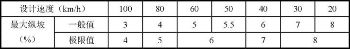 快速路的車速在60-100km/h,主干道的車速在40-60km/h;也就是說快速路的最大坡度在3-5%之間,主干道的最大坡度在5-6%之間。但是在實際的操作中,一般將主干道及快速路的坡度控制在3%以下,以上的數(shù)據(jù)可當(dāng)做極限值。