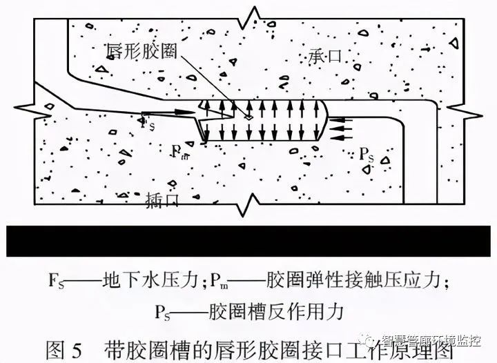 帶膠圈槽接口如圖5 所示。膠圈三相受擠,增加反力PS,加大了膠圈對工作面表面的擠壓接觸應(yīng)力,有利于提高接口的抗?jié)B能力。因此,在接口抗?jié)B要求嚴(yán)格的管道中建議采用帶膠圈槽接口。在中、大型地下綜合管廊工程中應(yīng)優(yōu)先選用帶膠圈槽楔形膠圈密封接口。