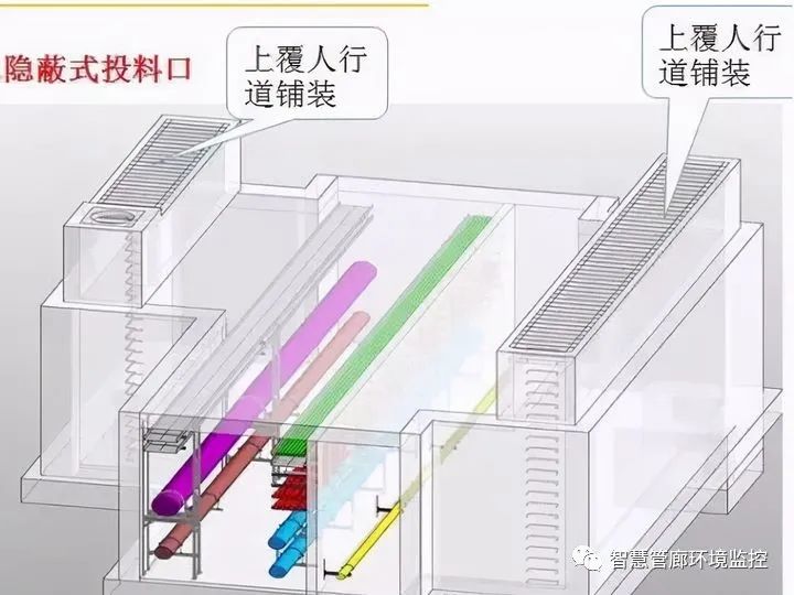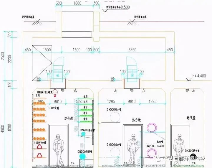 管廊的通風(fēng)機(jī)房一般利用管廊上方的空間設(shè)置,同時考慮到相交管線的穿越,管廊頂部覆土深度一 般為2.5-3.0m。這樣的做法導(dǎo)致起點(diǎn)的雨污水支管標(biāo)高與管廊就不能匹配。但是,管廊的覆土深度并不是只有2.5-3.0m,在特殊情況下,滿足抗浮 的 前提下,將管廊覆土減少至1.5m,此時,進(jìn)排風(fēng)井可采用外掛式,滿足通風(fēng)需求,同時結(jié)合雨污水標(biāo)高,甚至將起點(diǎn)雨污水管道納入綜合管廊。